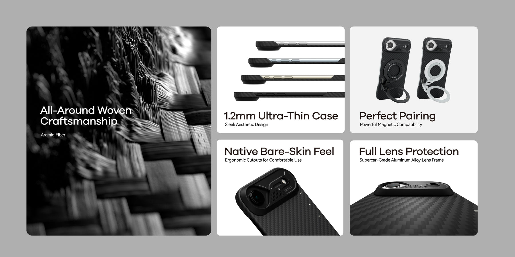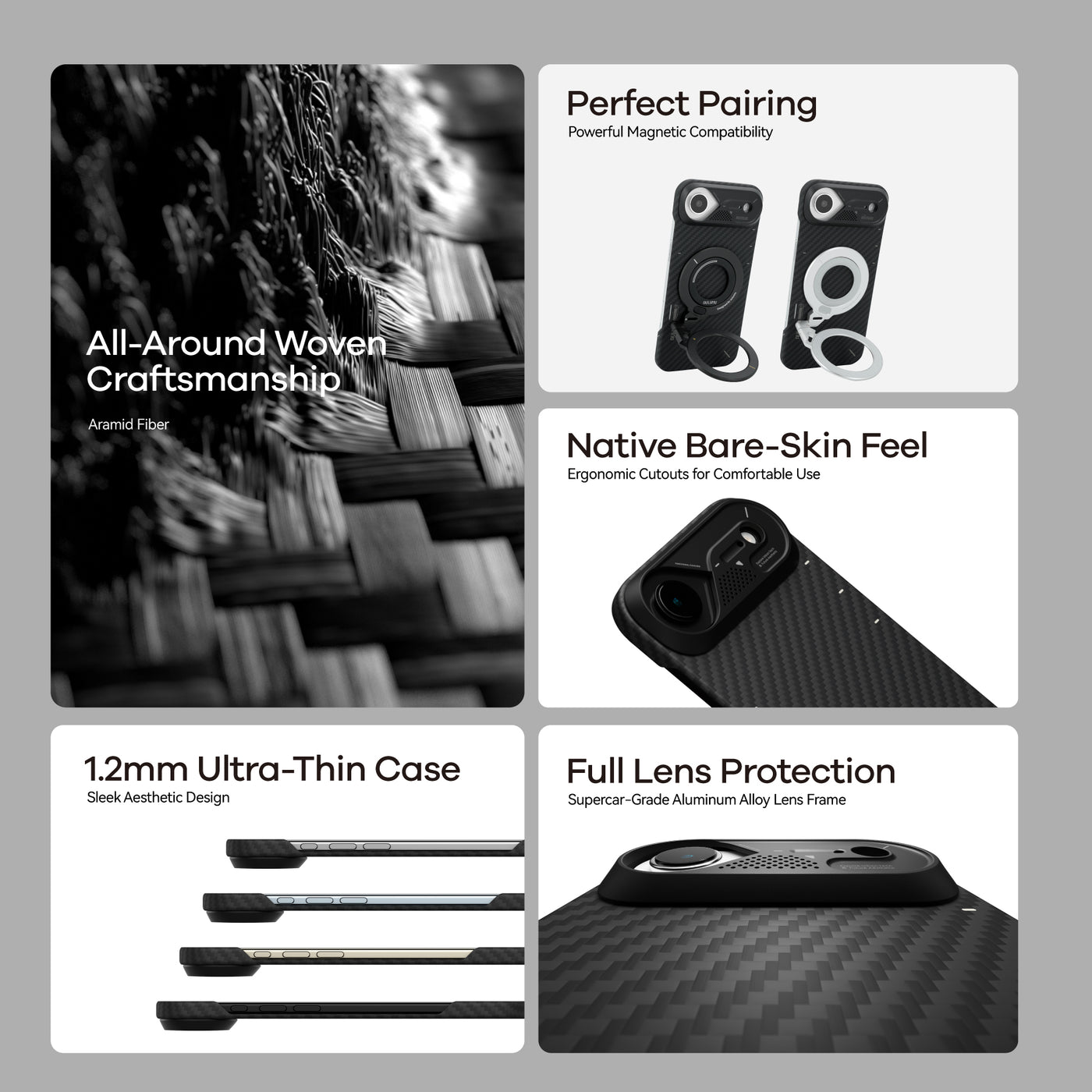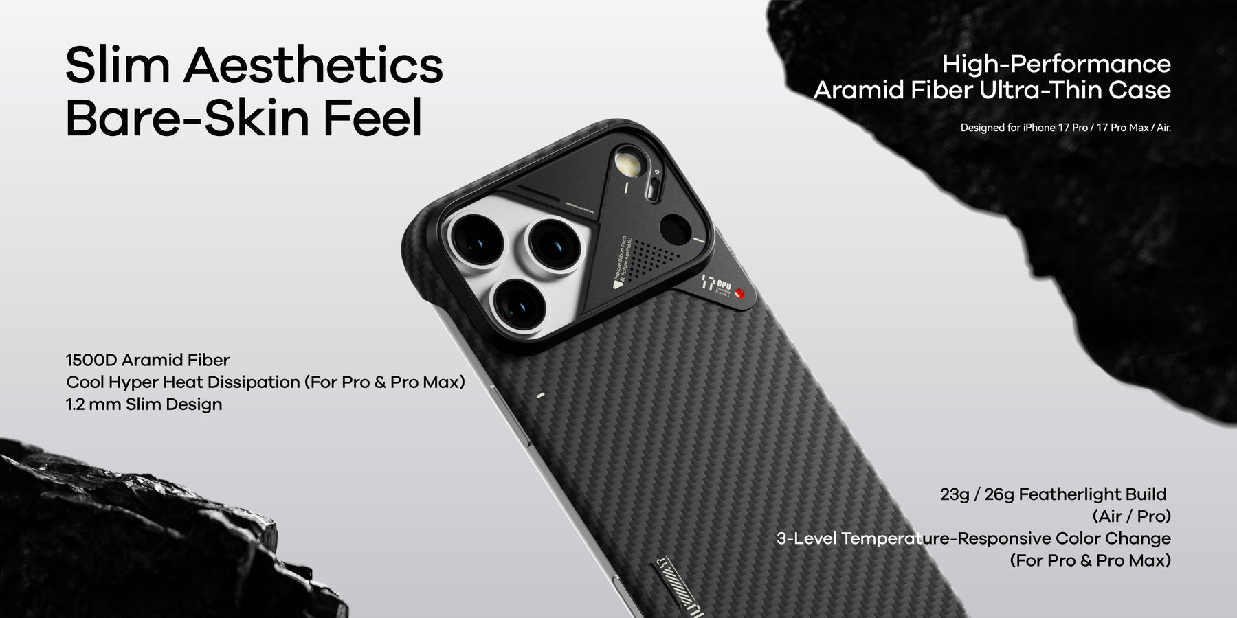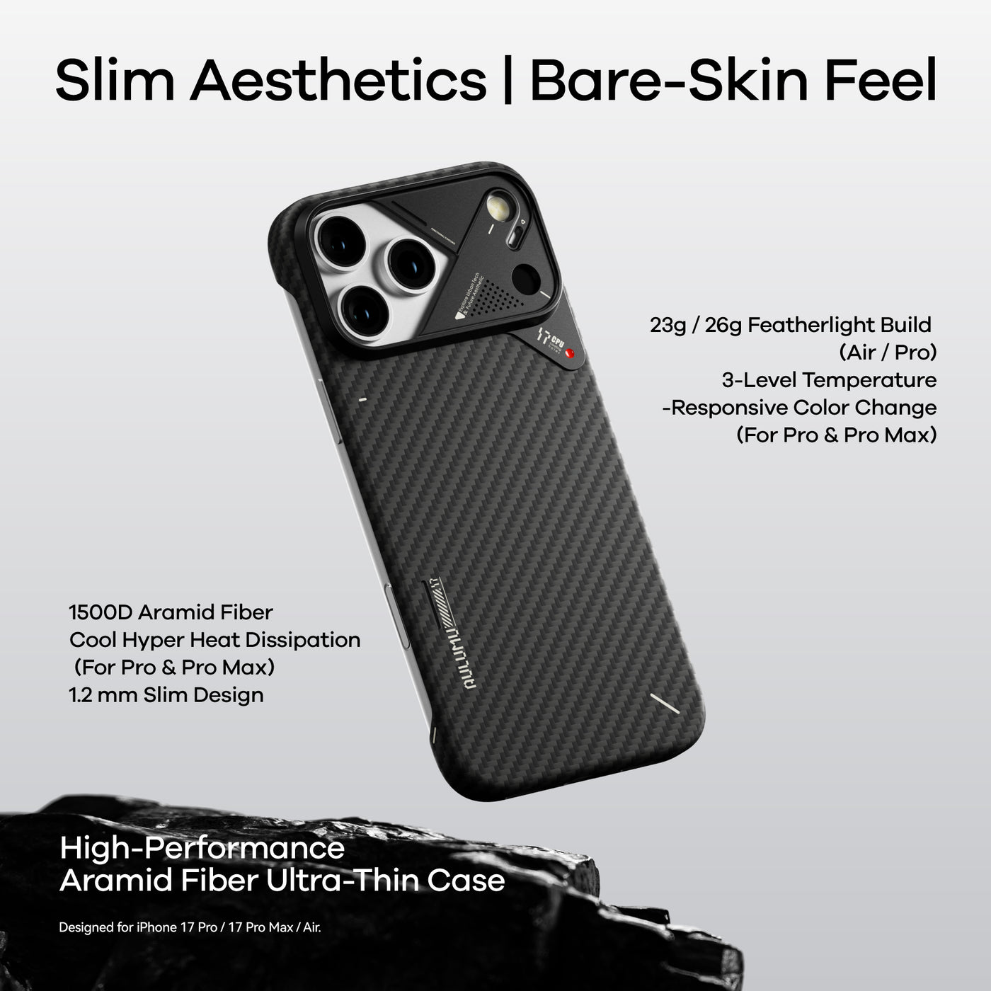 Building on the sleek design of our classic aramid fiber cases, the A17 Case brings ultra-thin, ultra-light protection to the iPhone 17 Series. Crafted from premium aramid fiber with an upgraded aluminum camera frame, it combines timeless durability with modern enhancements for smarter everyday use. Compatible with MagSafe and designed for a secure, comfortable grip, the A17 elevates both style and functionality for iPhone 17 Pro, 17 Pro Max and Air.