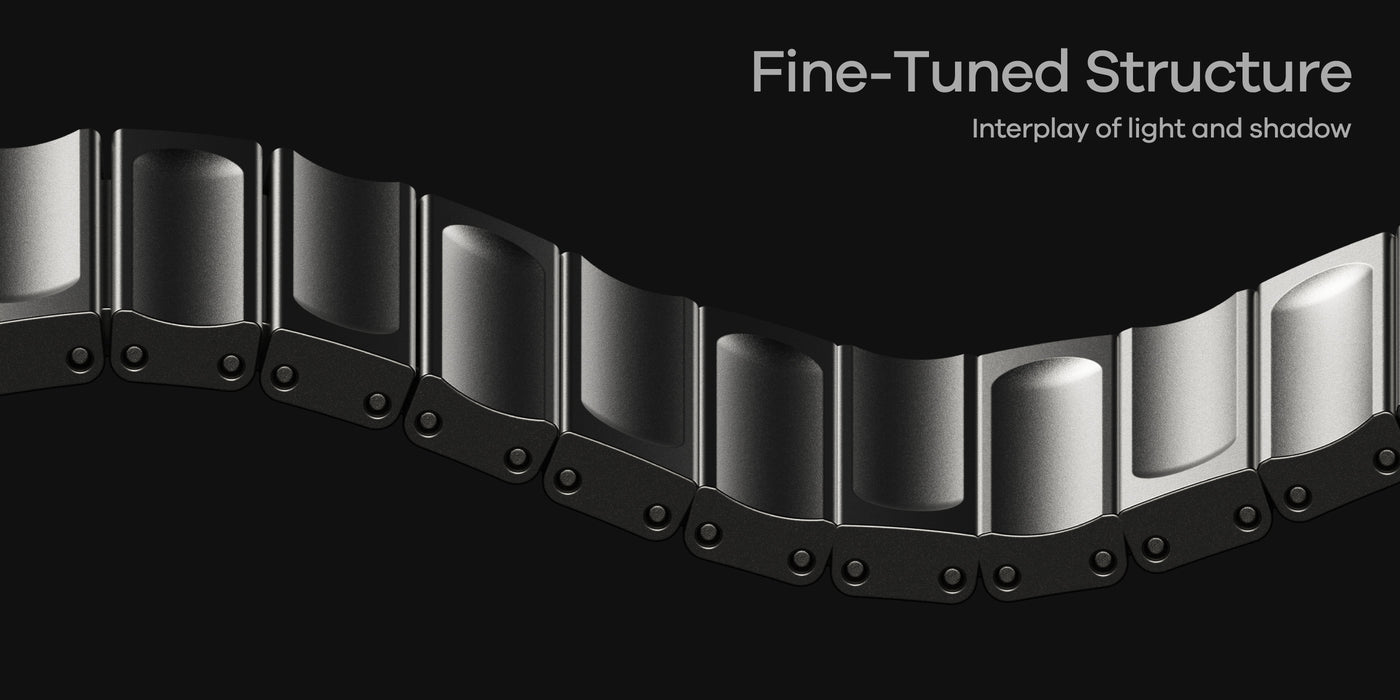 Born from the idea of turning raw strength into quiet elegance, the C01 Watch Band takes shape through titanium — a material once built for the skies, now refined for the wrist. Each curve and contour is carved with precision, revealing a seamless balance between durability and grace. What began as engineering became an expression of restraint, purpose, and enduring beauty.